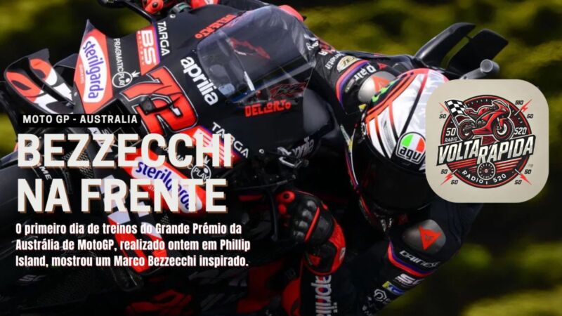 O primeiro dia de treinos do Grande Prémio da Austrália de MotoGP, realizado ontem em Phillip Island, mostrou um Marco Bezzecchi inspirado. O piloto da Aprilia cravou 1min26s492, quebrando o recorde da pista e superando a marca anterior de Jorge Martín por 0s754. Mesmo lidando com uma lesão nas costas e cumprindo uma penalização de “long lap”, Bezzecchi deixou claro que chega forte para o fim de semana.